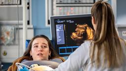 Die schwangere Romy Hegel wird aufgrund ihrer starken Unterleibsschmerzen von Dr. Julia Berger mittels Ultraschallbild untersucht.